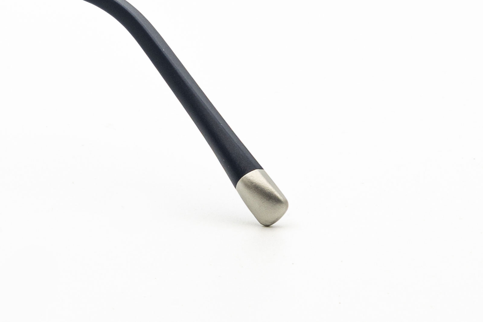 矯正レンズの入るフロントには軽量で形状安定性のある樹脂。 テンプルには、薄いステンレスを使用し、弾性とコスト削減を実現。先端に、ステンレスの重しを付けることで、後ろに引っ張る重心を付け、前にメガネがずれるのを防ぐ、工夫がしてあります。