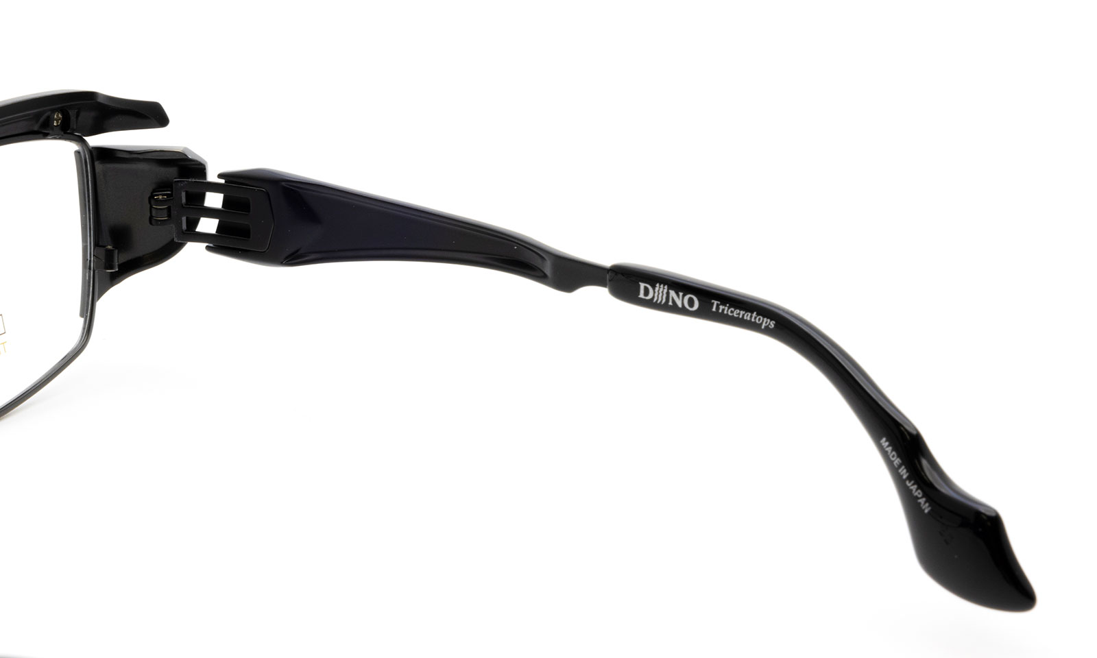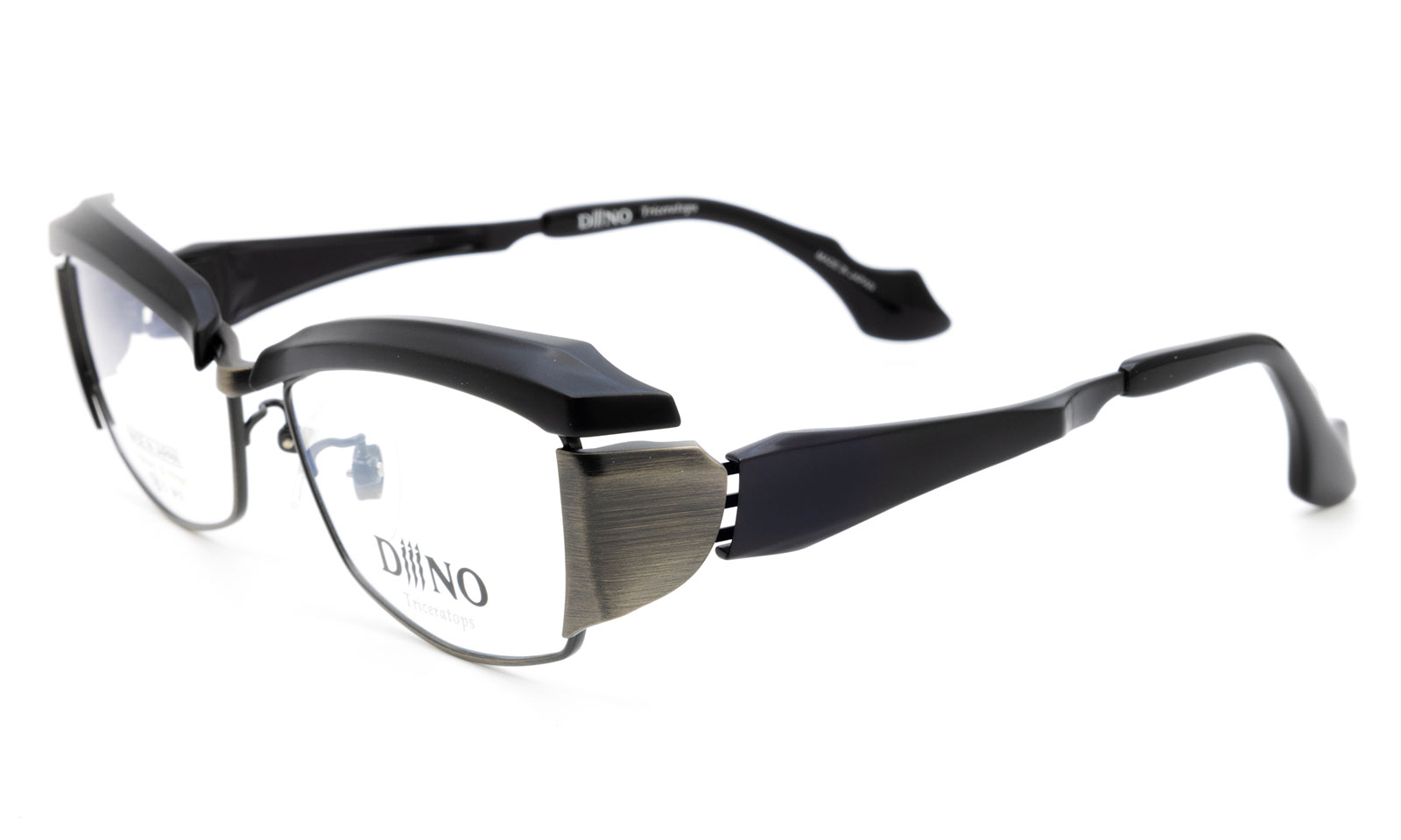 古代ギリシャ語で「3本の角を持つ顔」を意味するトリケラトプスは、後期白亜紀に生息した体重焼く12トンにも及ぶ植物食動物だ。本作では、その特徴を的な姿をフレームに投影。ブリッジと左右のブロウバーで、3本の角をヨロイで角の後ろのフリルを表現した。重量感が伝わるデザインながら、トリケラトプスのフリルが見た目より軽いのと同じく、ブロウバーにもテンプルにも随所に裏肉落としが施されていて、かなり軽量化されている。
