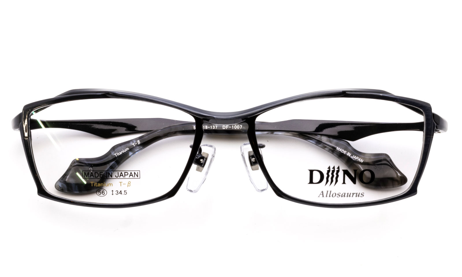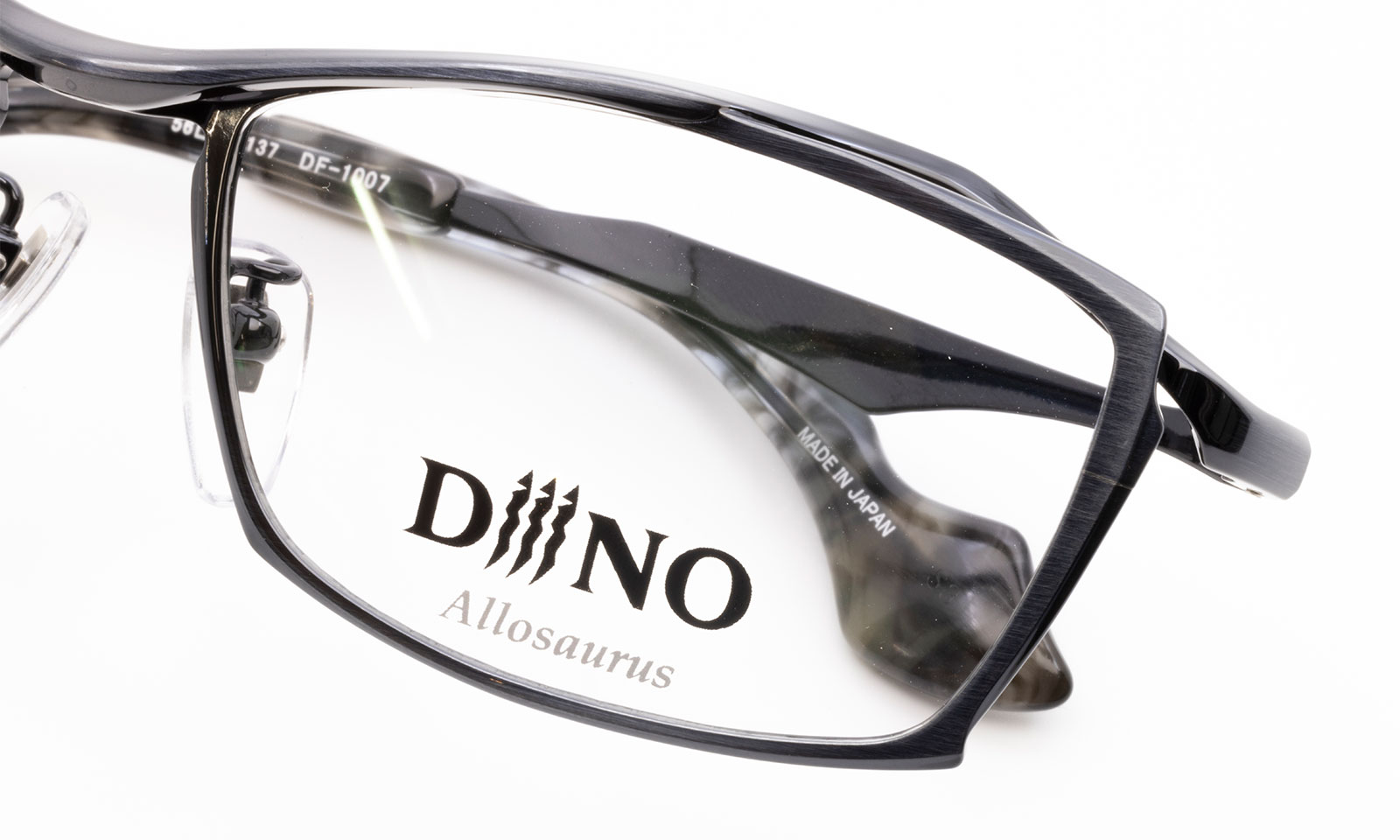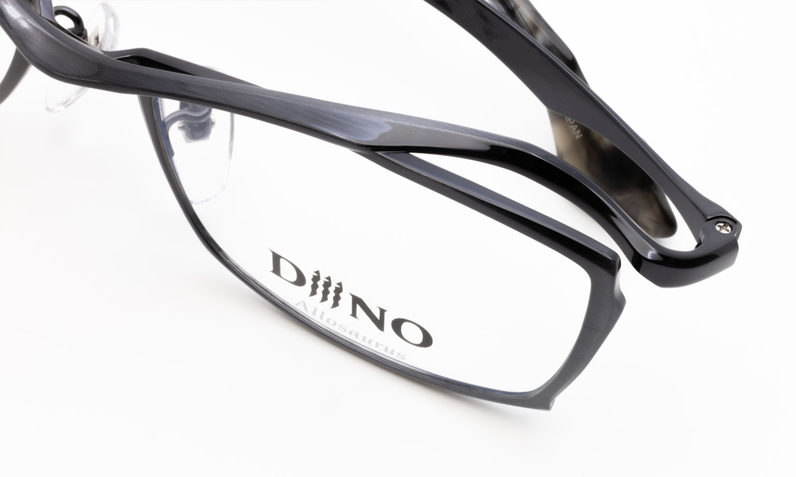 アウロサウルスの最大の特徴である目の上の突起をブローパーツの形状で表現しています。テンプルにはアウロサウルスの横顔(口元)をイメージした凹ラインをプレス加工し、躍動感をプラスしています。