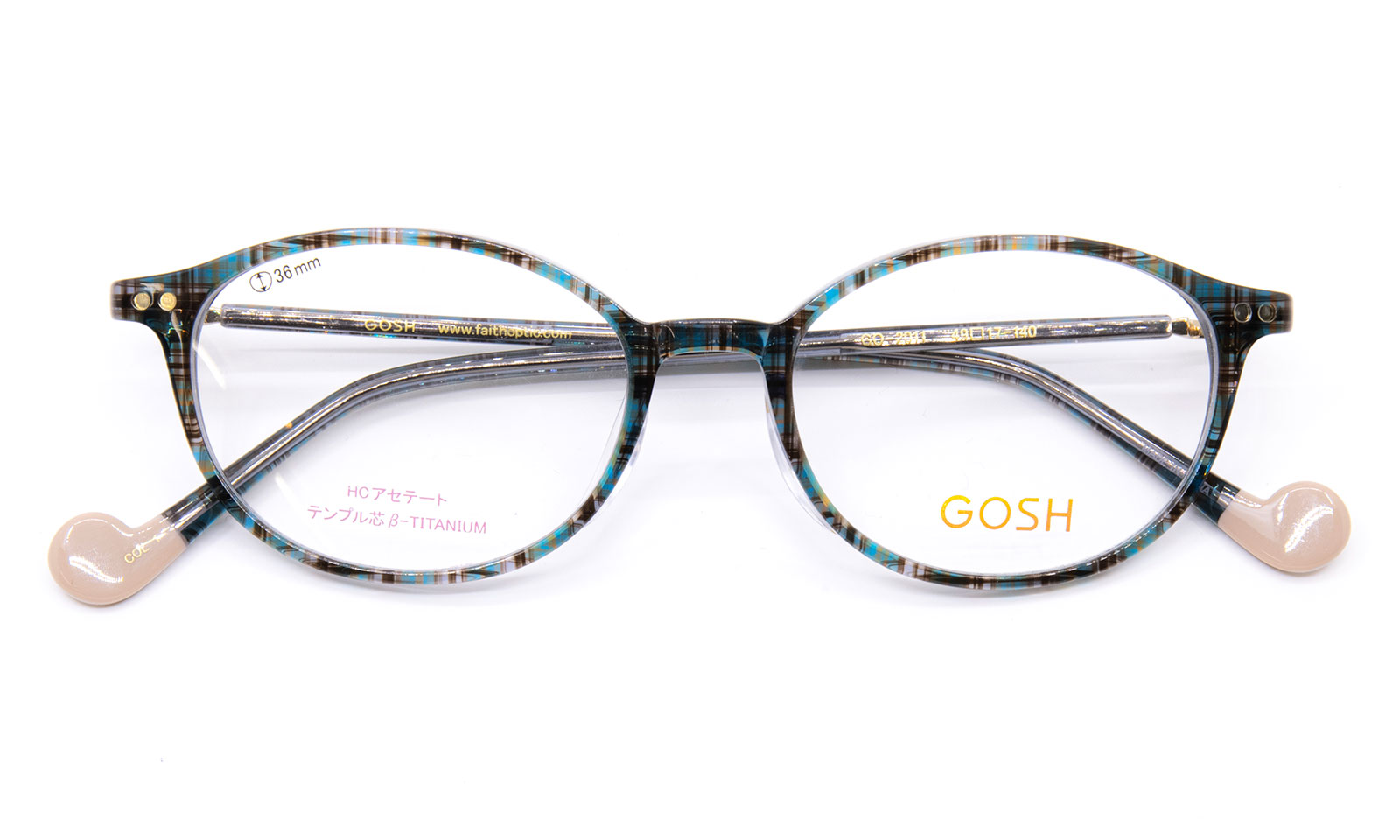 フロントは、アセテートHCフレーム。テンプル芯は、弾性のあるβチタンニウム。チェック柄で、掛け替えが多くても、広がりずらいフィットするフレーム。