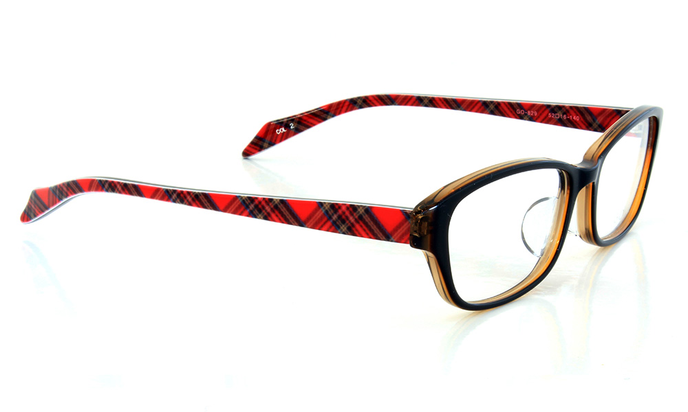 テンプルが赤のチェック柄という、異色のセルフレーム。