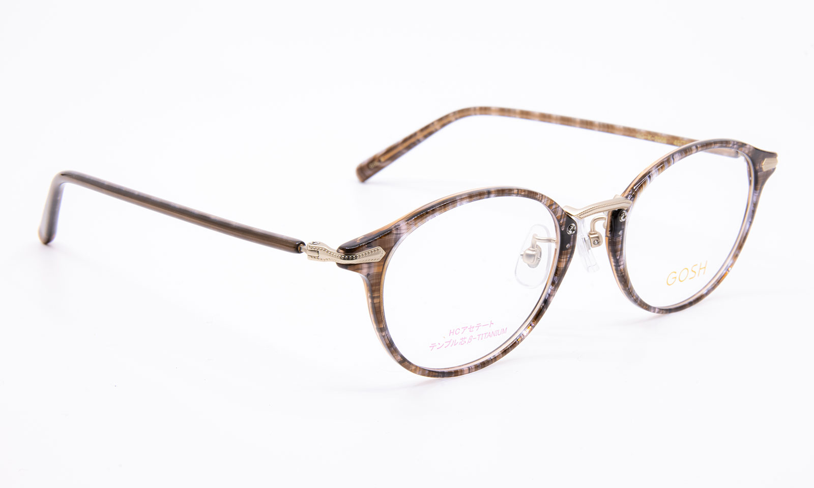 フロントは、HCアセテートフレーム。テンプル芯は、弾性のあるβチタンニウム。広がりずらいフィットするフレーム。
