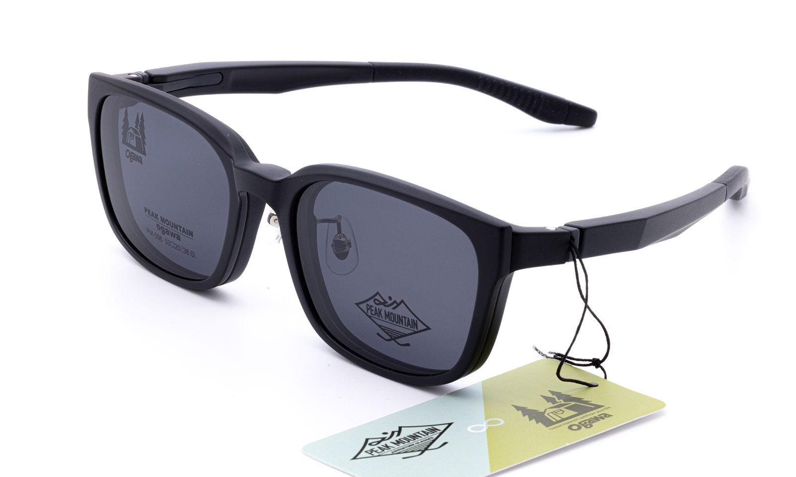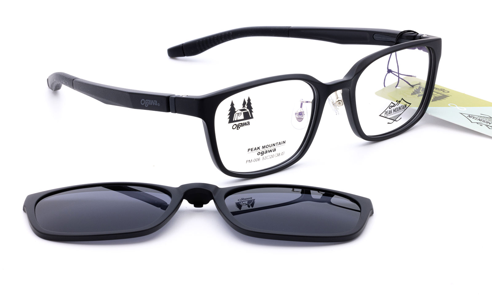 プラスチック素材で、安価にまとめたマグネットオンの偏光サングラスが付いたメガネフレーム。