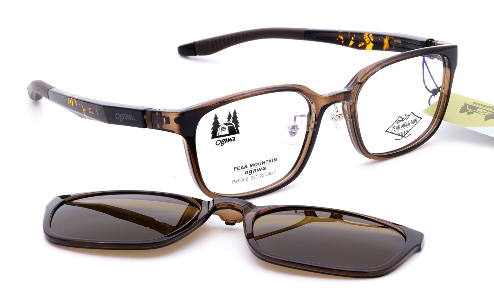 プラスチック素材で、安価にまとめたマグネットオンの偏光サングラスが付いたメガネフレーム。