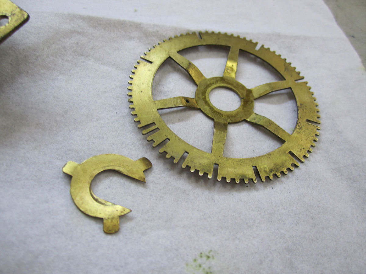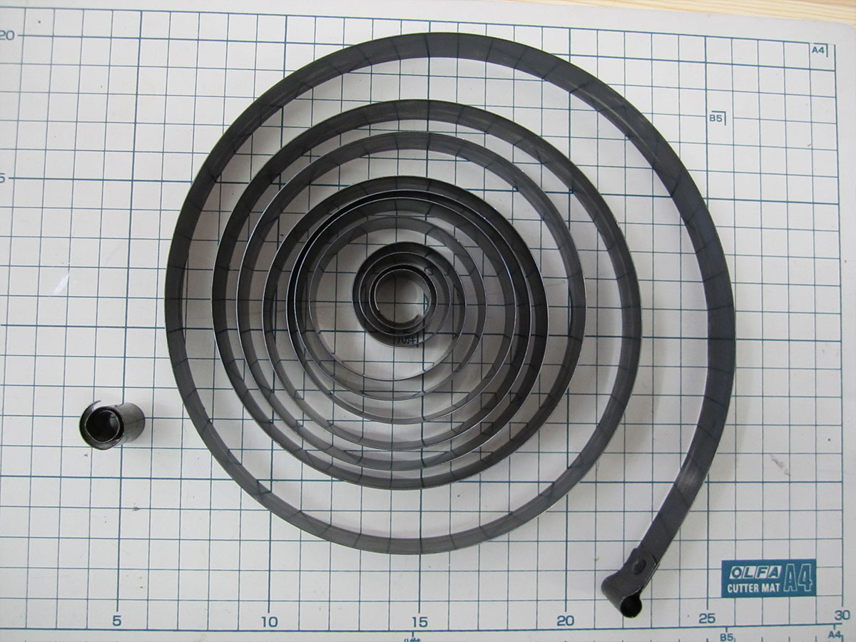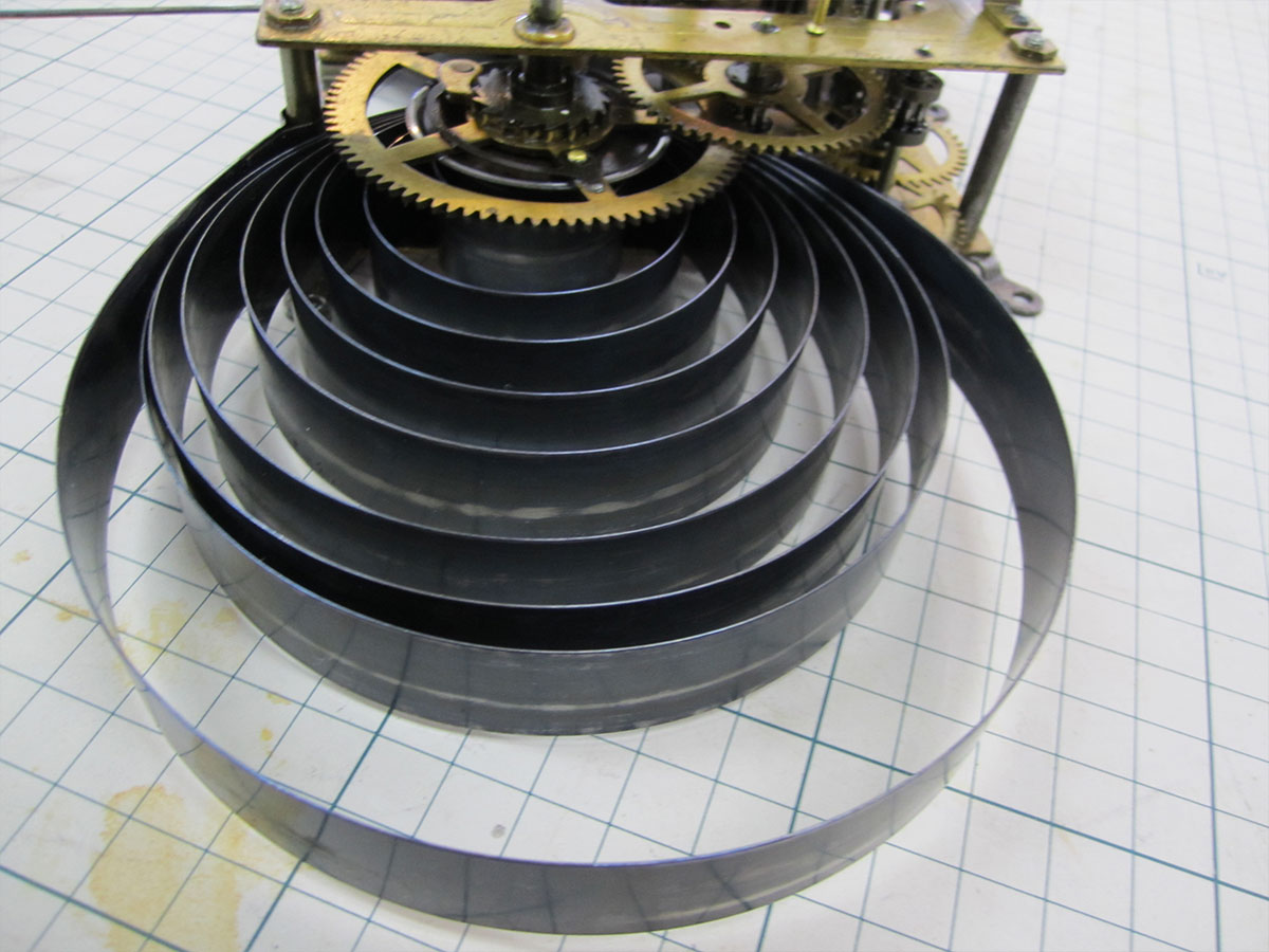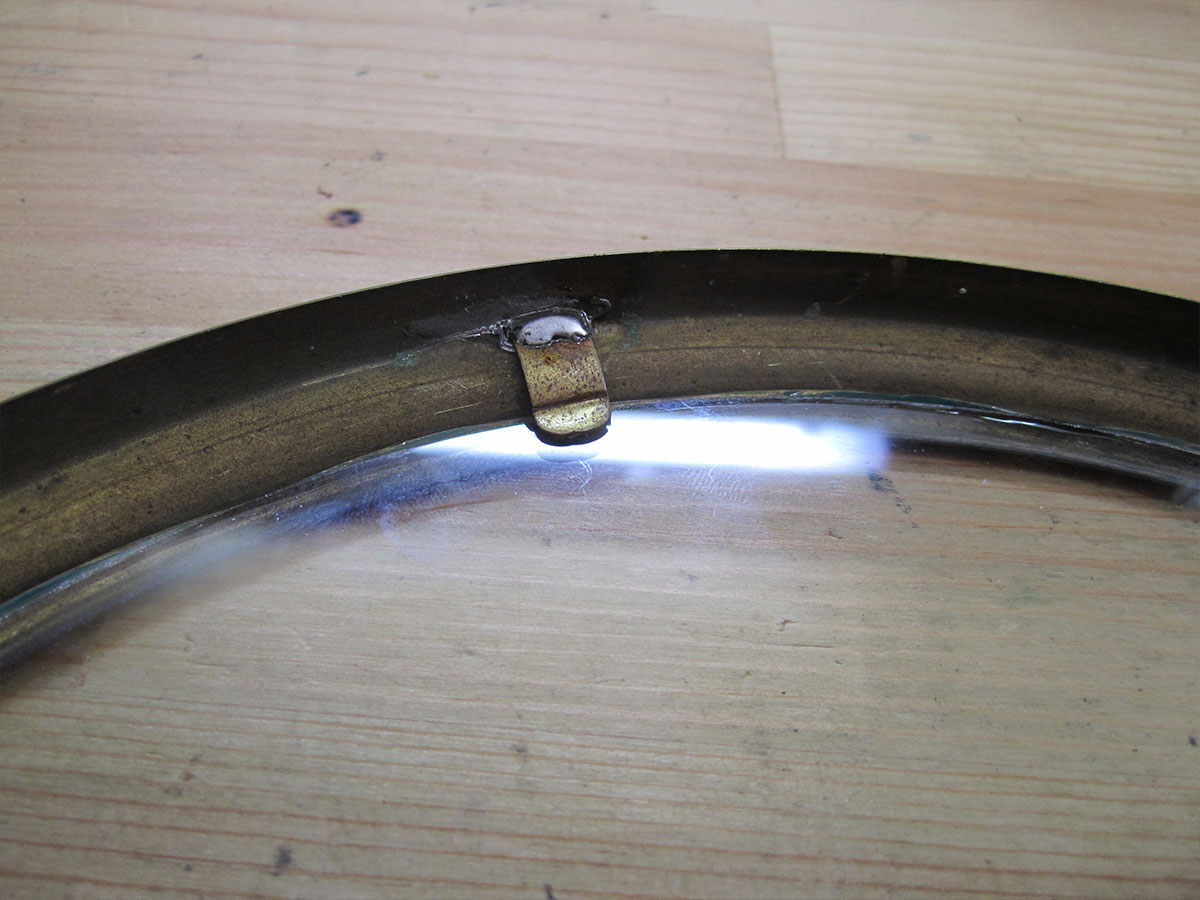 ゼンマイ切れの修理です。ゼンマイの片方が切れゼンマイが巻けない状態になっています。ゼンマイの残った中央部分を加工し、シャフトに引っかかるように加工します。あとは、摩耗した部分を修正。ガラスも制作し、ガラスを止めている部分も修理しました。