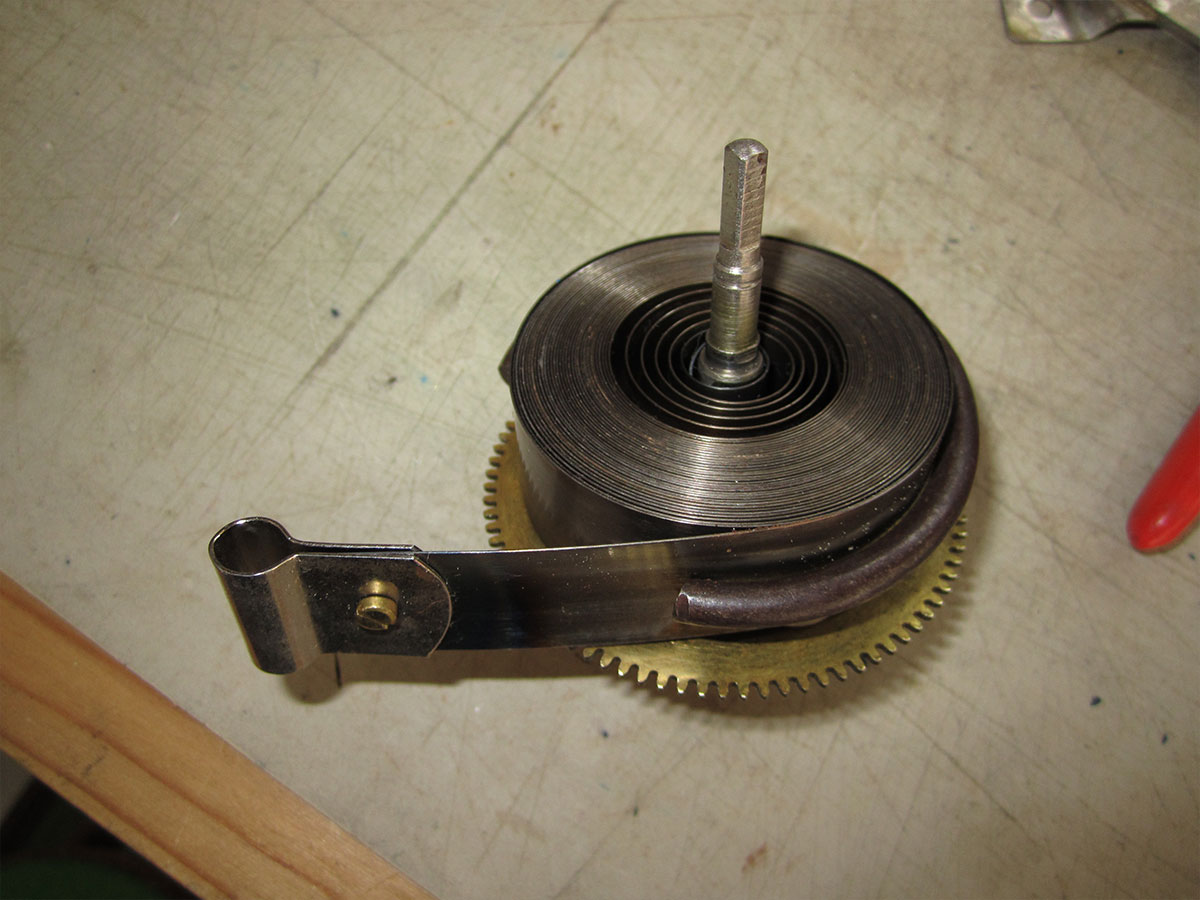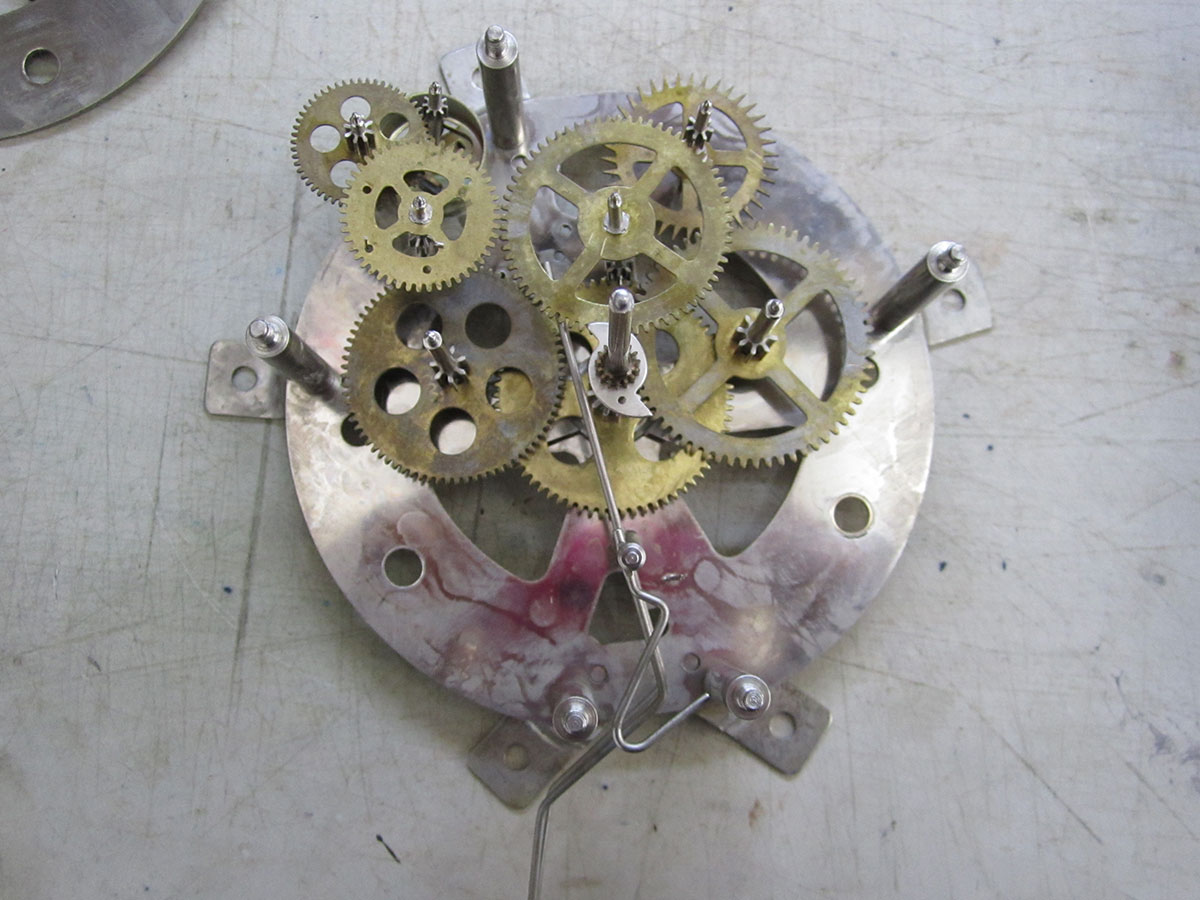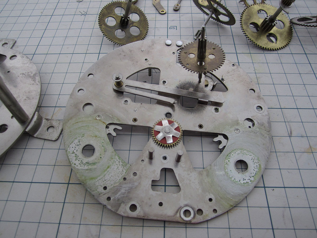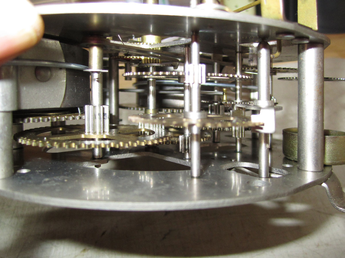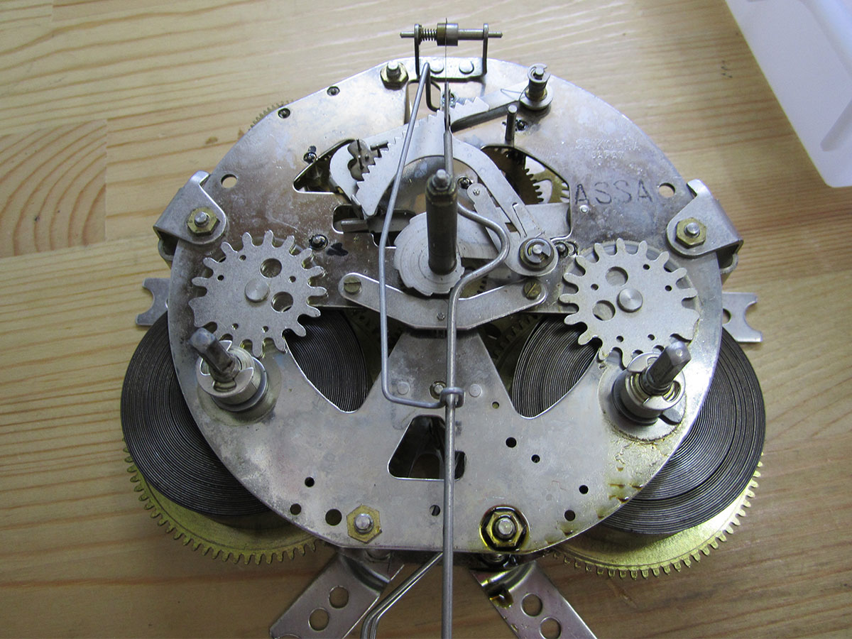 セイコーの30日巻のゼンマイ式柱時計です。比較的新しい時計です。機械のシャーシは真鍮製ですが、めっきが施されて、変色しにくくなっています。 これは、オイルの劣化とギアの軸ズレが見られるので、全面オーバーホール。分解、洗浄し、輪列の調整を行いでオイルの劣化と輪列の調整15か所行いました。