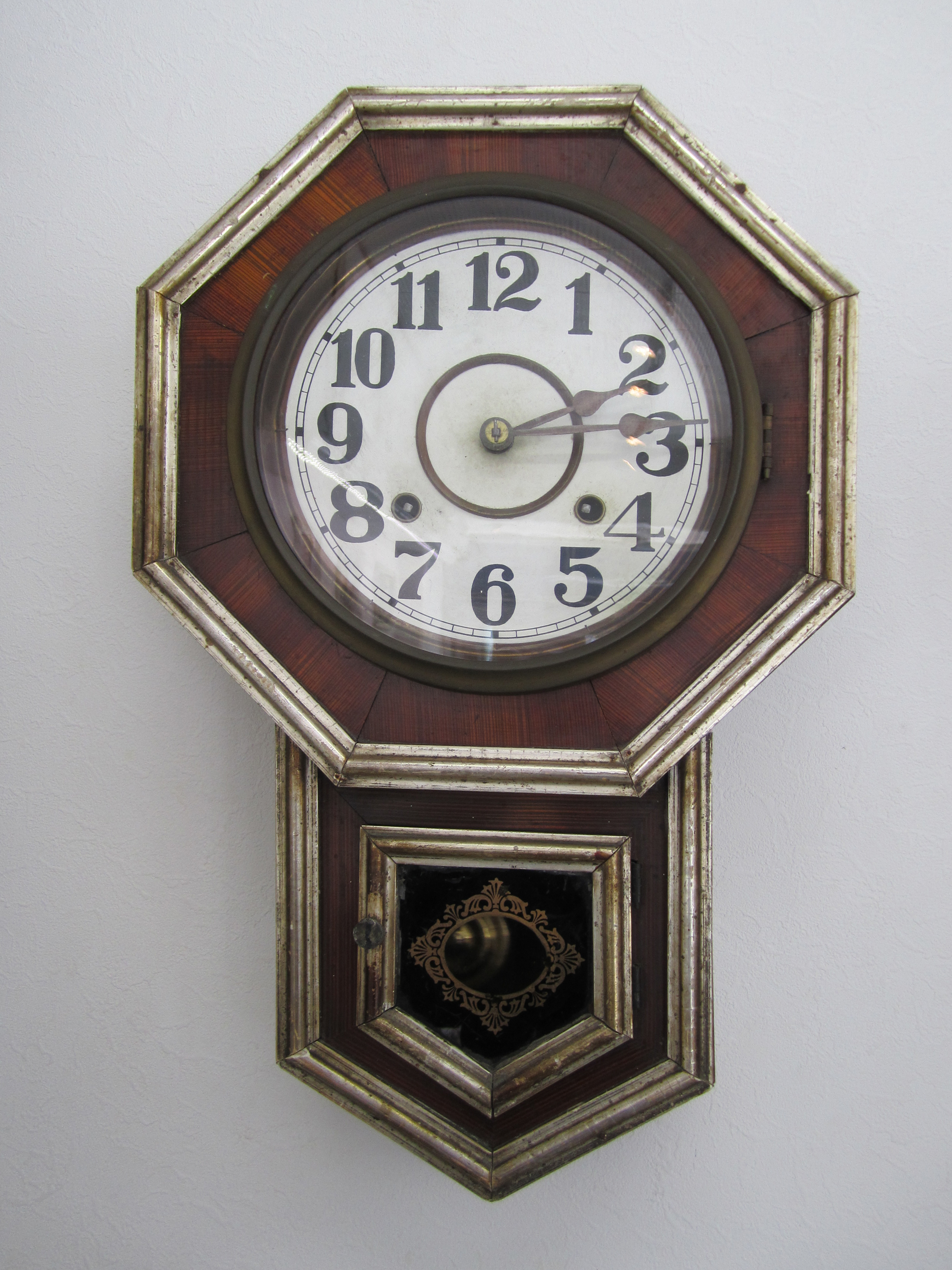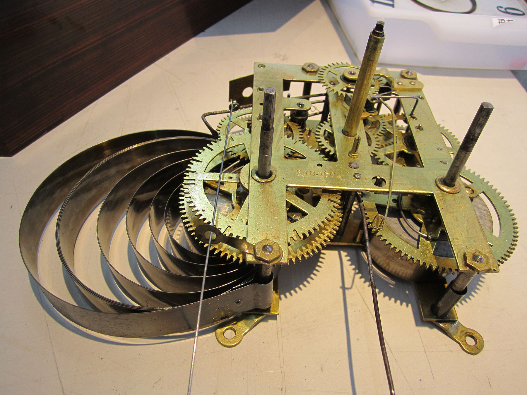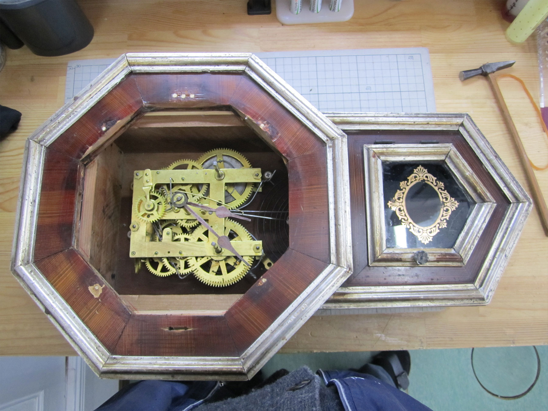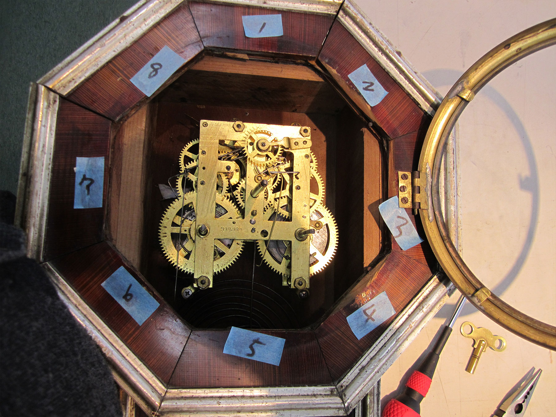 アイチ製のゼンマイ式8角型柱時計です。経年劣化による一部ケースの外れがあります。 まず、機械を取り出し、全面オーバーホール。シャーシから磨き上げギアの曲りと破損も修正。 ケースは、はずれを接着し直し、ネジ穴もゆるくなっているので埋め直し、新しい、真鍮のネジに変えて修理。