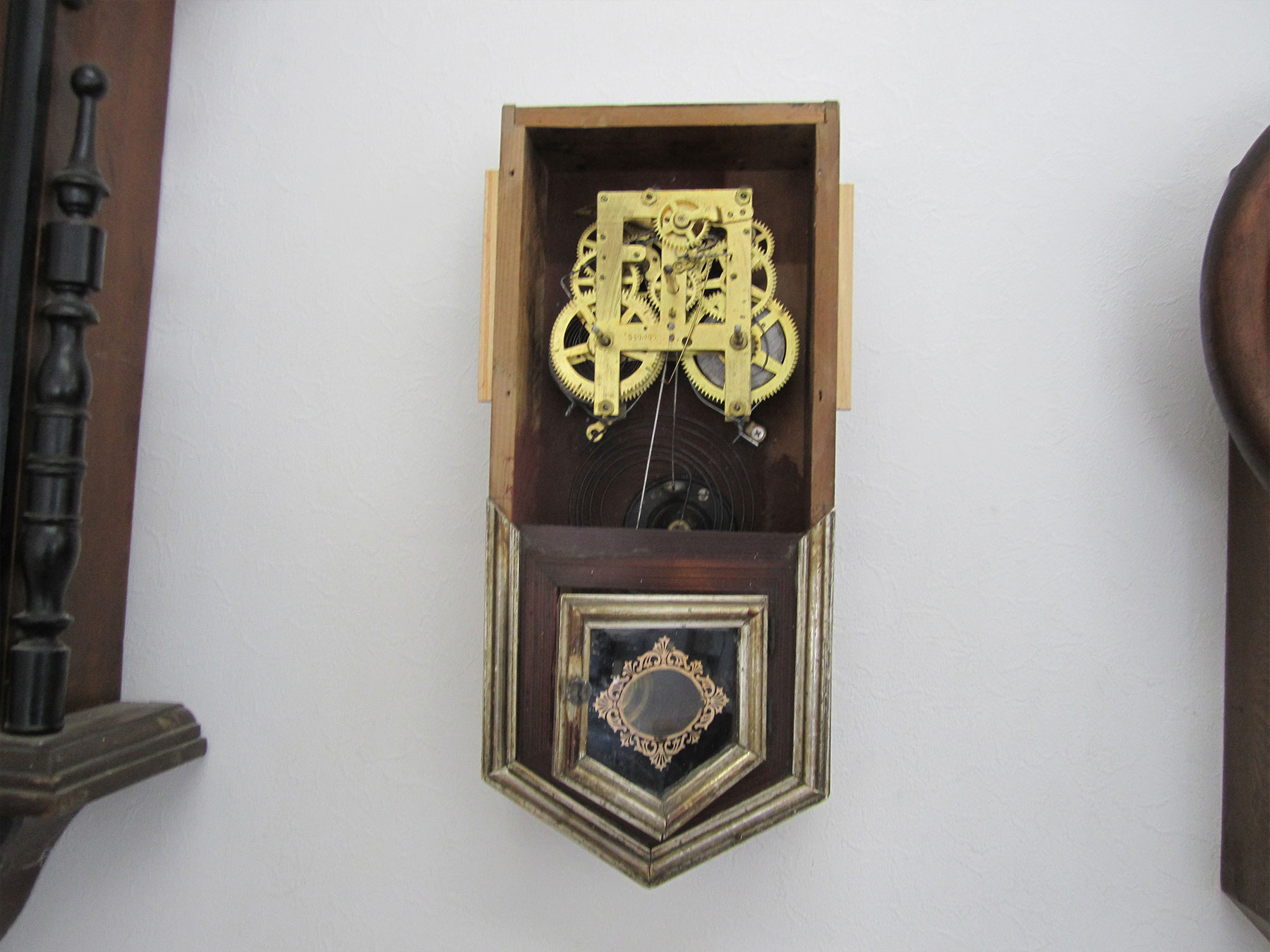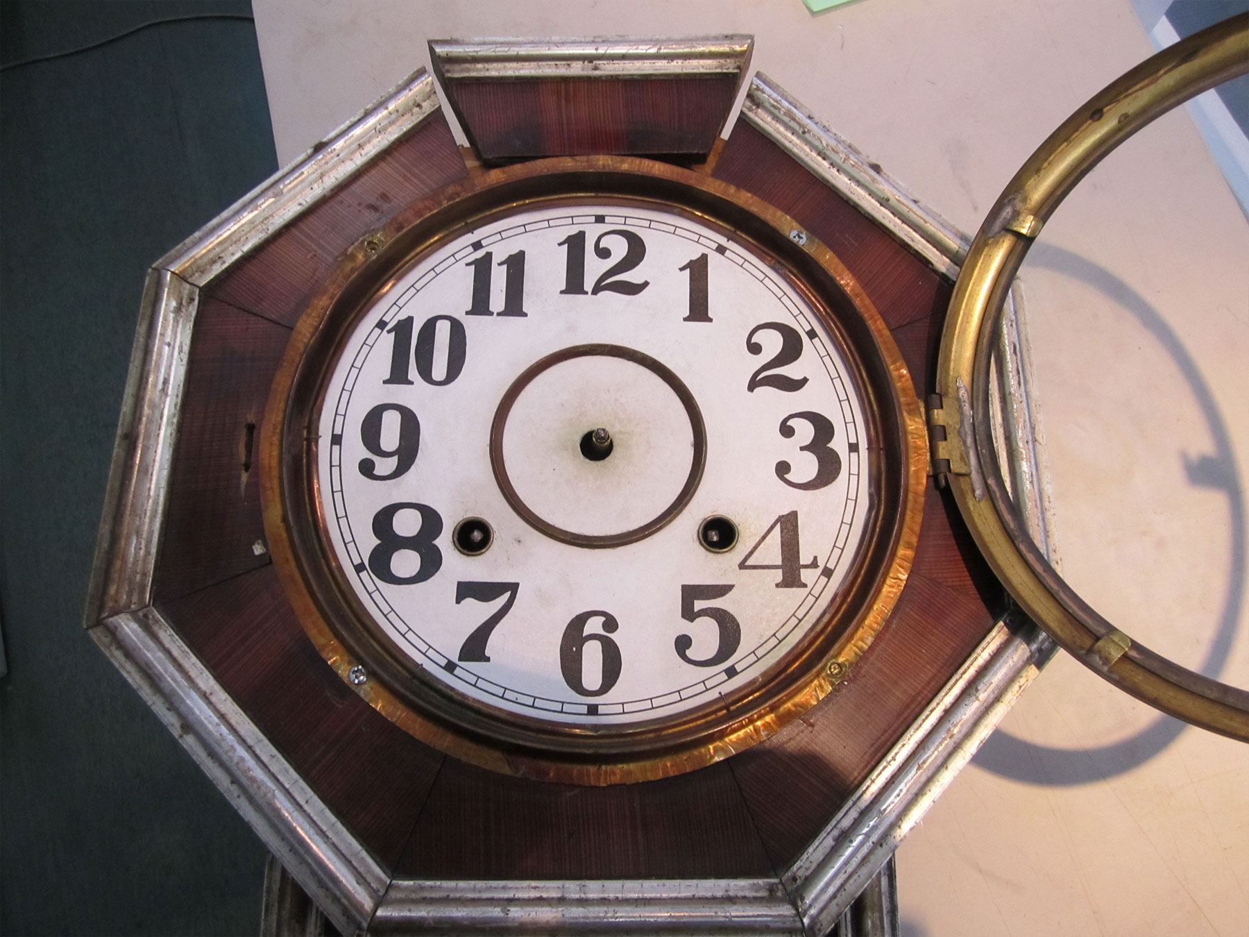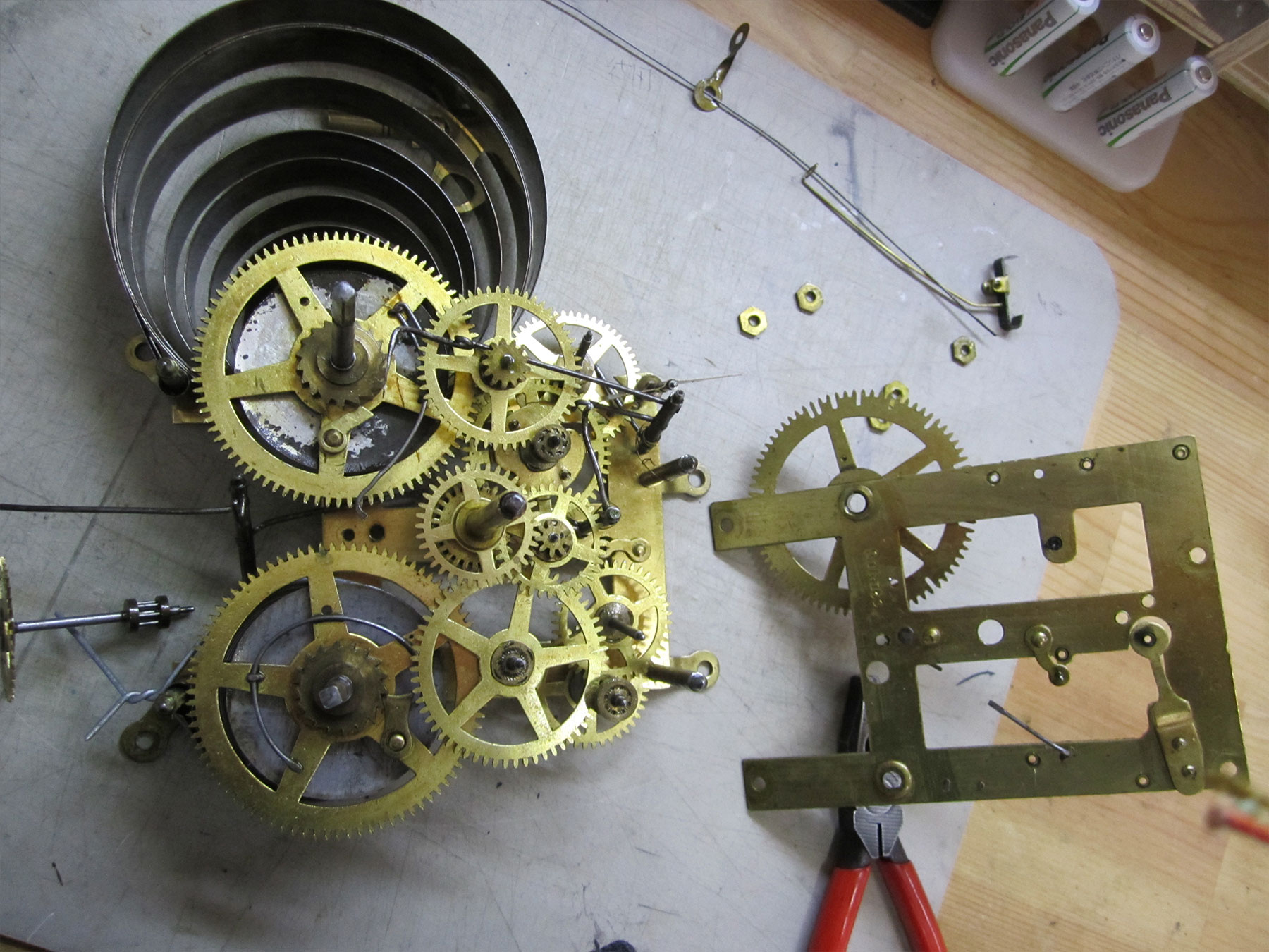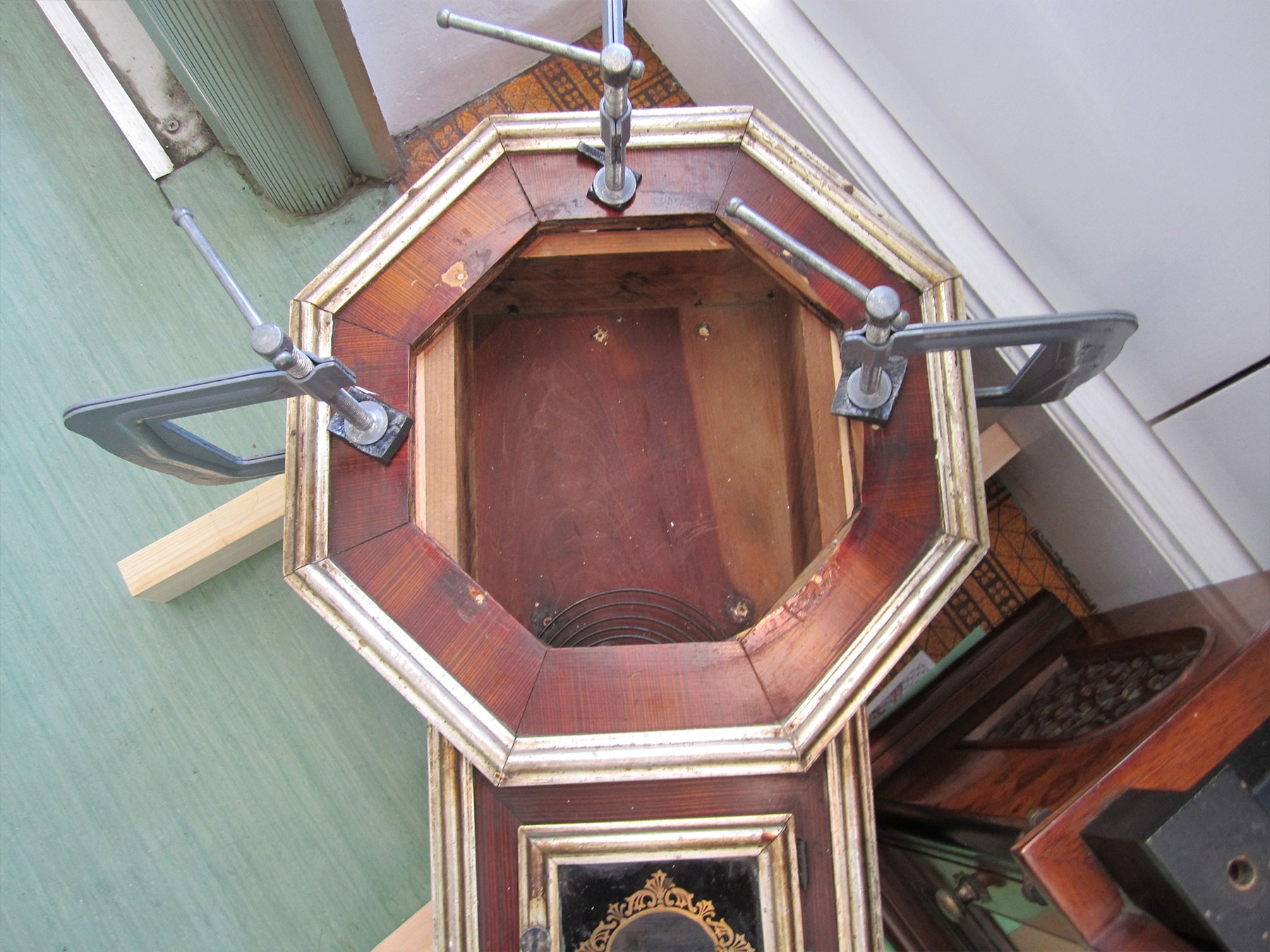アイチ製のゼンマイ式8角型柱時計です。経年劣化による一部ケースの外れがあります。 まず、機械を取り出し、全面オーバーホール。シャーシから磨き上げギアの曲りと破損も修正。 ケースは、はずれを接着し直し、ネジ穴もゆるくなっているので埋め直し、新しい、真鍮のネジに変えて修理。