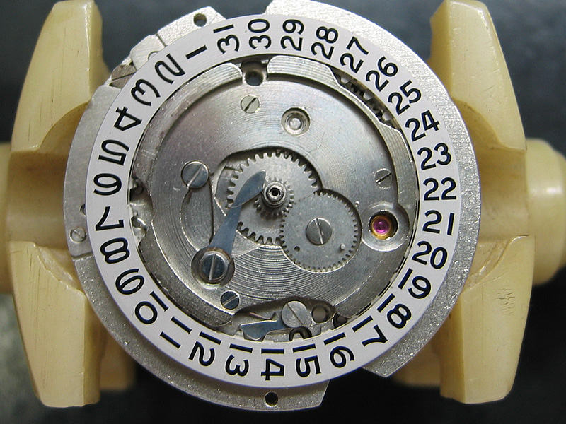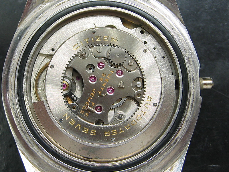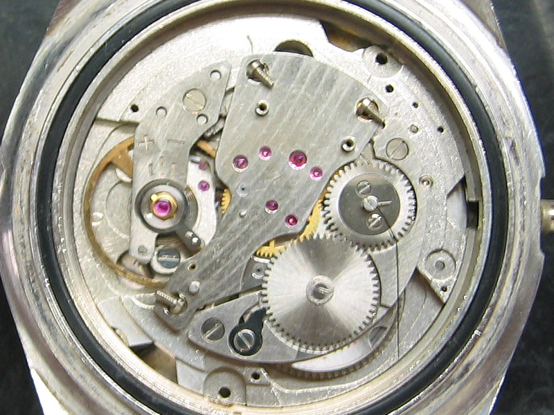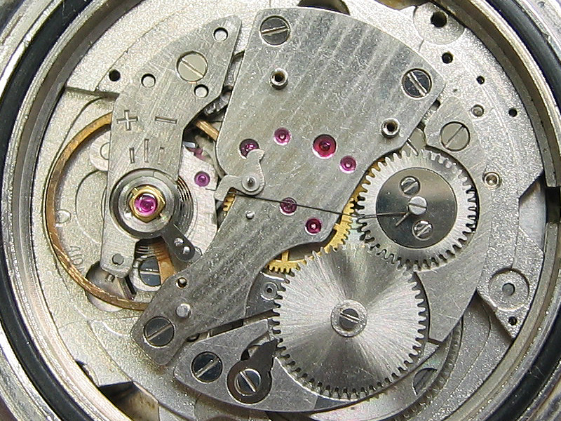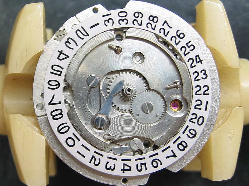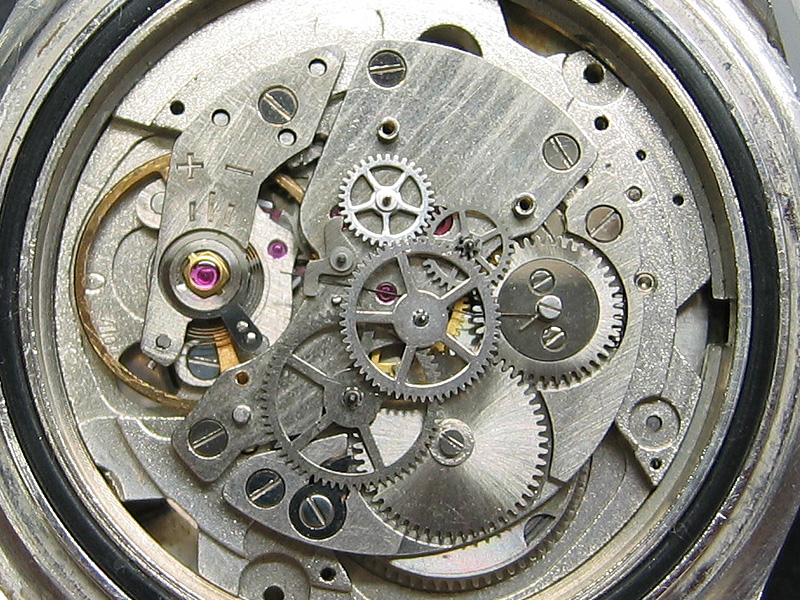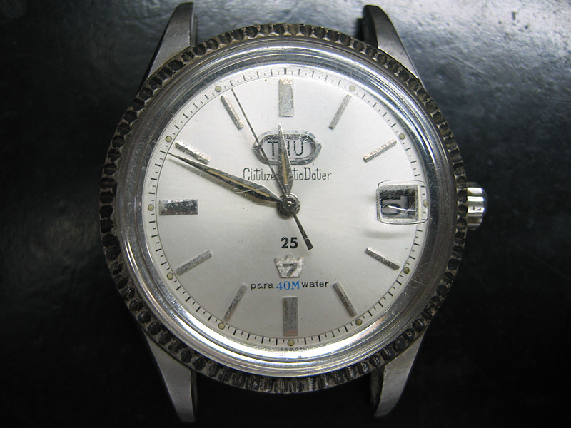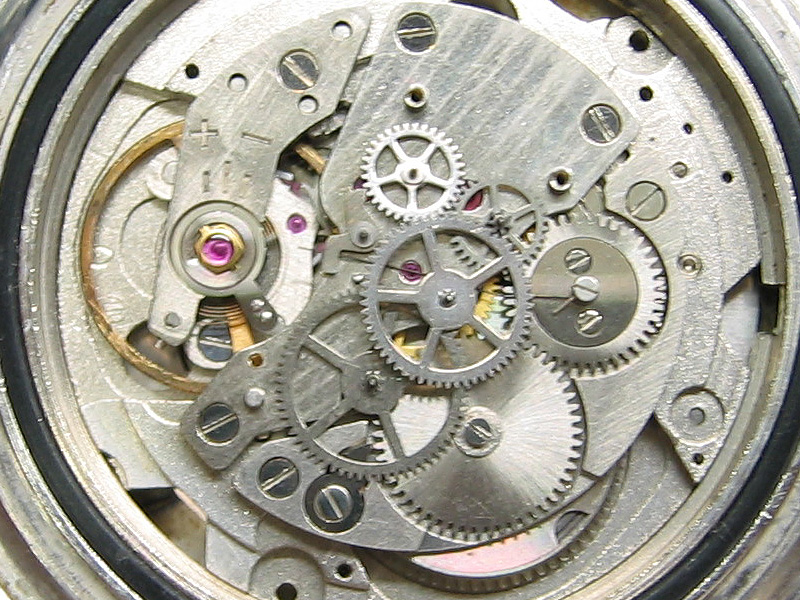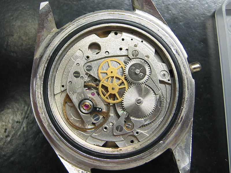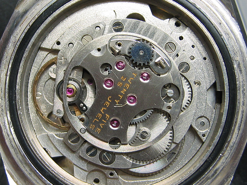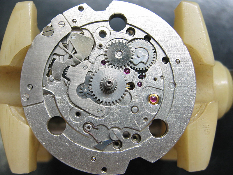 こいつも廃品BOXの中に、無造作にしまいこんでありました。外装は、傷だらけ、べゼルには、素人が塗ったような黒が塗ってあって。とりあえず動くので、オーバーホールすることにした。裏蓋を開けると、大きな振り子が。最近にないセンター1点持ちじゃなく、リングタイプの大きなおもり(ジェットーローター)。ちょっと戸惑ったが、そのまま分解してみた。面白い機構ですねー、ごっついシャーシに英語しかないカレンダー。年代がわかりますね~。分解し、軸受けや、てんぷ・ギアも洗浄し、組み上げケースの研磨、べゼルの黒を落としレンズを磨き、きれいに復活しました。
