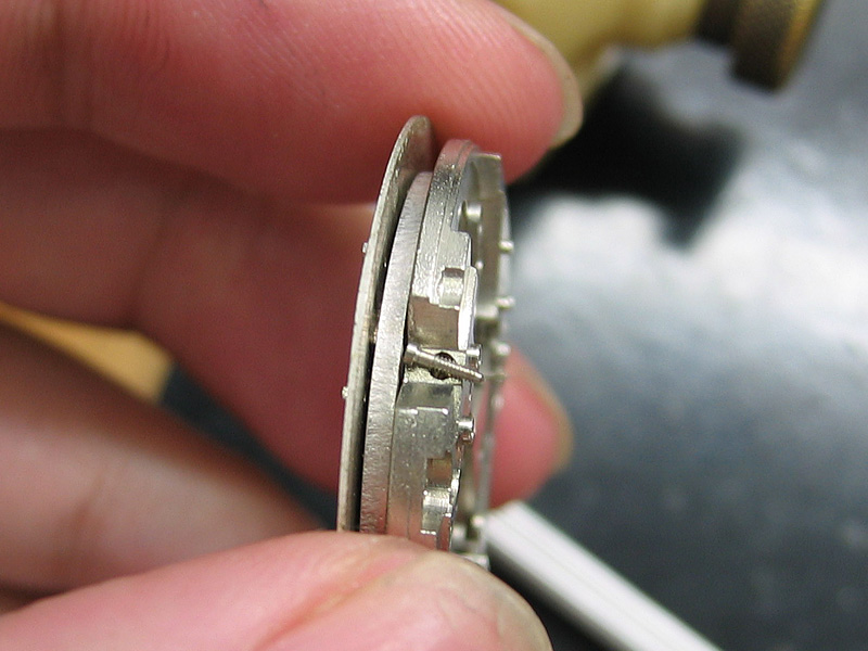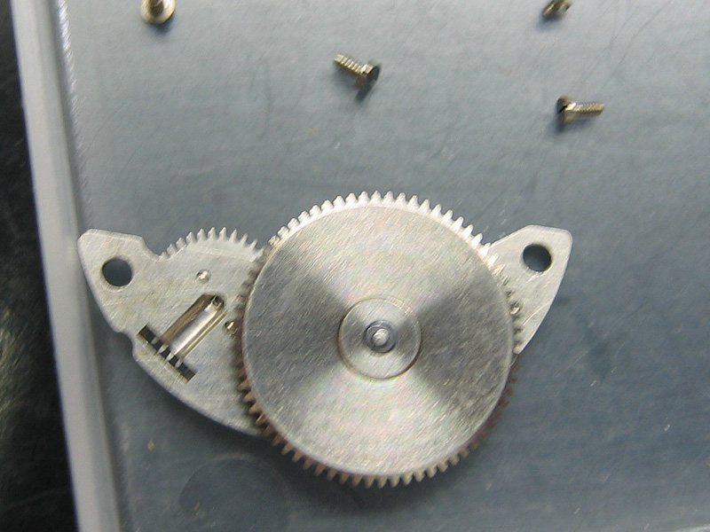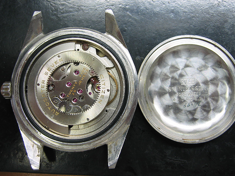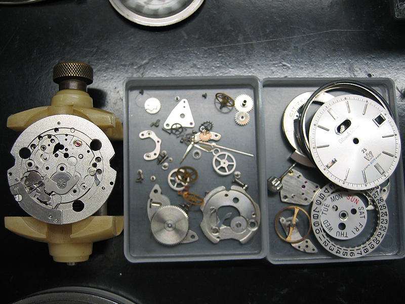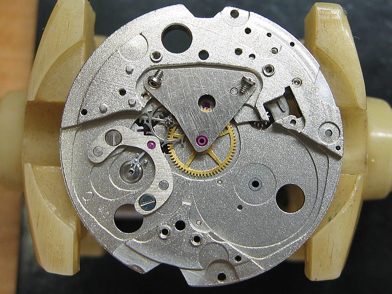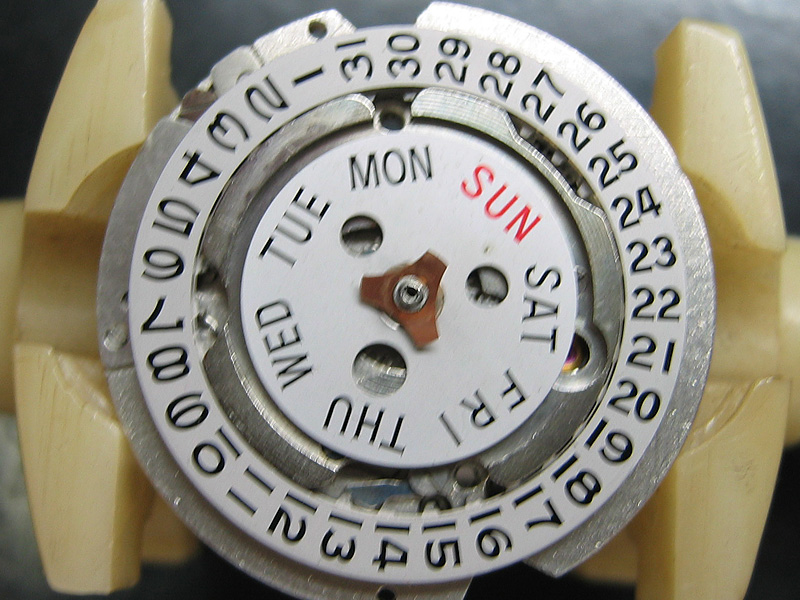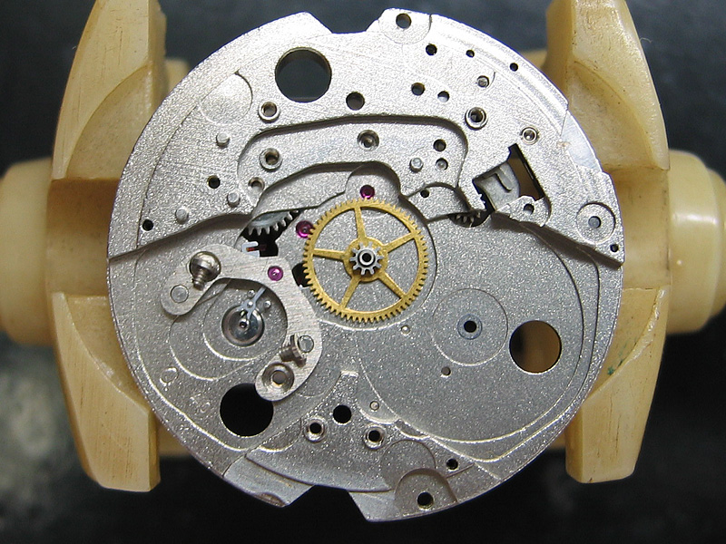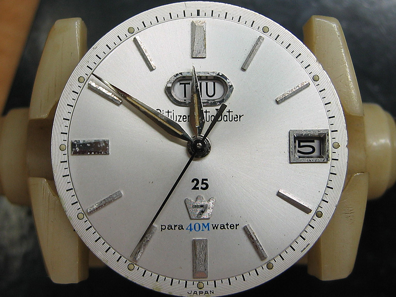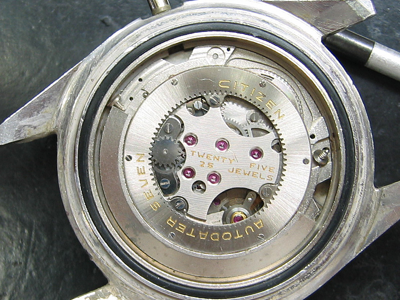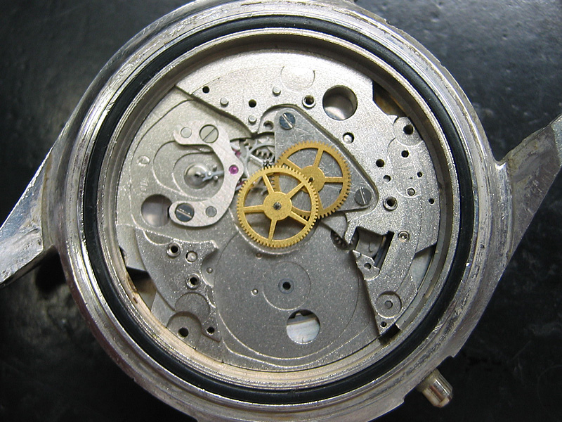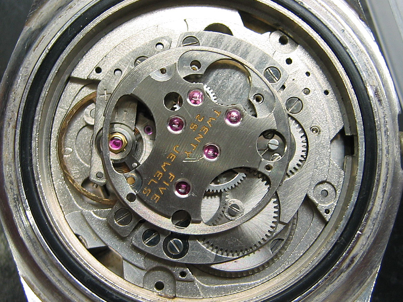 こいつも廃品BOXの中に、無造作にしまいこんでありました。外装は、傷だらけ、べゼルには、素人が塗ったような黒が塗ってあって。とりあえず動くので、オーバーホールすることにした。裏蓋を開けると、大きな振り子が。最近にないセンター1点持ちじゃなく、リングタイプの大きなおもり(ジェットーローター)。ちょっと戸惑ったが、そのまま分解してみた。面白い機構ですねー、ごっついシャーシに英語しかないカレンダー。年代がわかりますね~。分解し、軸受けや、てんぷ・ギアも洗浄し、組み上げケースの研磨、べゼルの黒を落としレンズを磨き、きれいに復活しました。