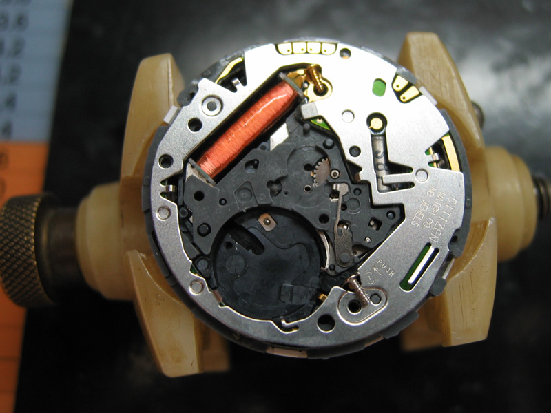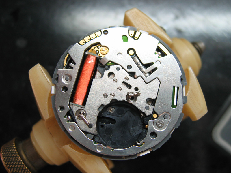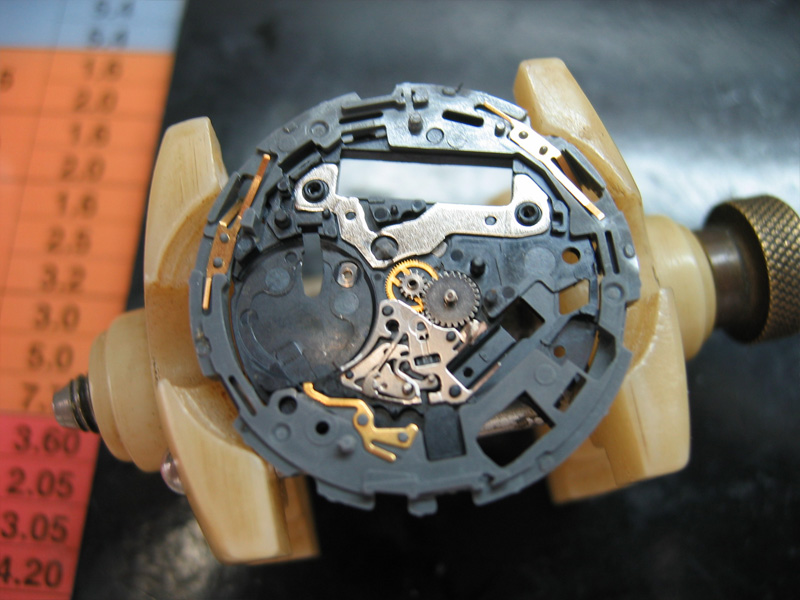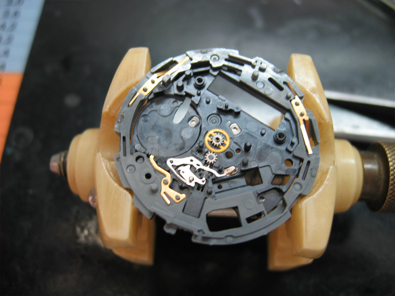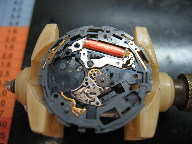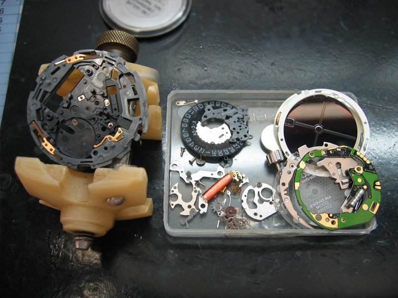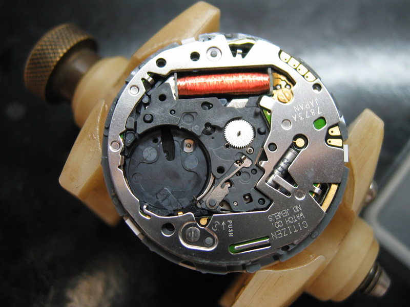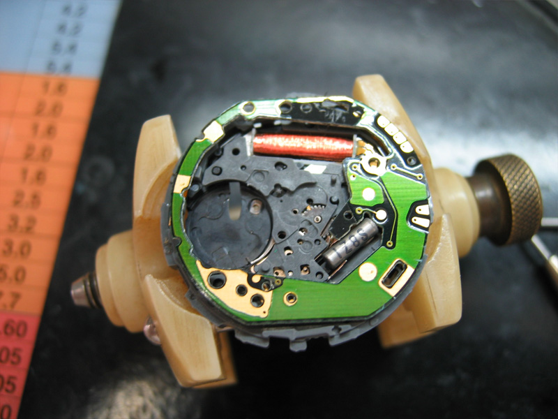動かなくなって1年以上放置されていました。秒針は、振れてはいますが、先に進みません。エコドライブなので、まず2次電池を交換してみましたが、様子は変わらず。あとは、機械にゴミがありギアが動かないと判断。