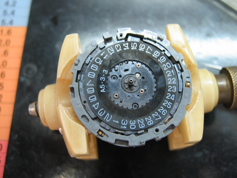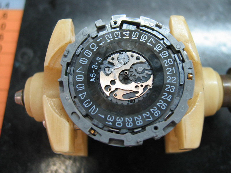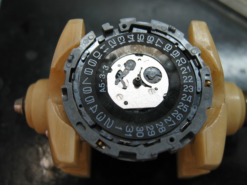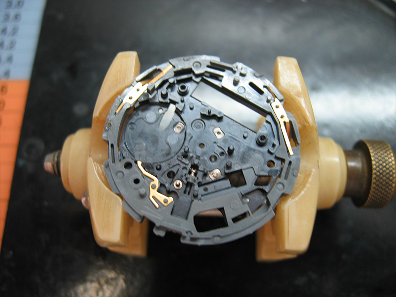 エコドライブなので、ソーラーパネルとの接点を確認しながら、どんどんバラしていきます。機械部分をざっと洗浄してさらに組み立てる部品を顕微鏡で確認し、さらに丁寧に洗浄、ちょっとの汚れもまた分解する手間を考えると完璧に洗浄します。モーターや付近のギアがかなり汚れていました。今回苦労した点は、リューズの機構です。板バネとプラスチックのシャーシがねじれて、カチッとなかなか閉まりません。金属シャーシなら、カチッとしていますが、ギアはすんなりはまるように設計されていますが、シャーシがねじれるのが、欠点でしょうか? 一応直り現在は、ちゃんと動いておりますが、プラスチックギアなどが経年劣化でいつ壊れるかは、わかりません。