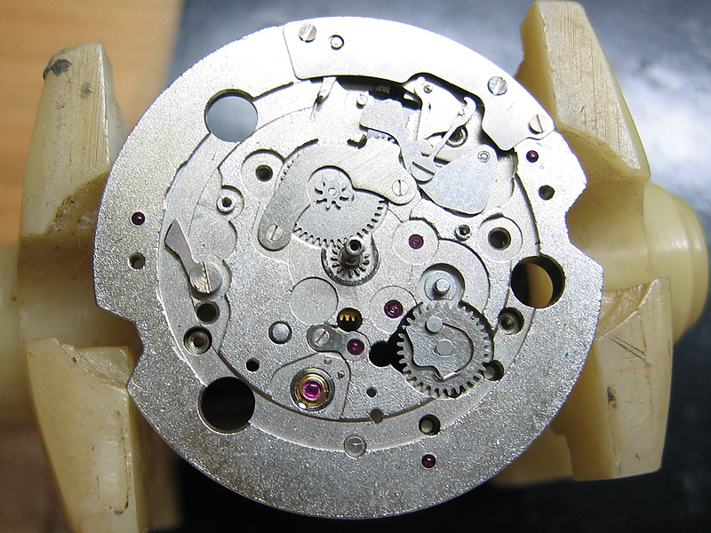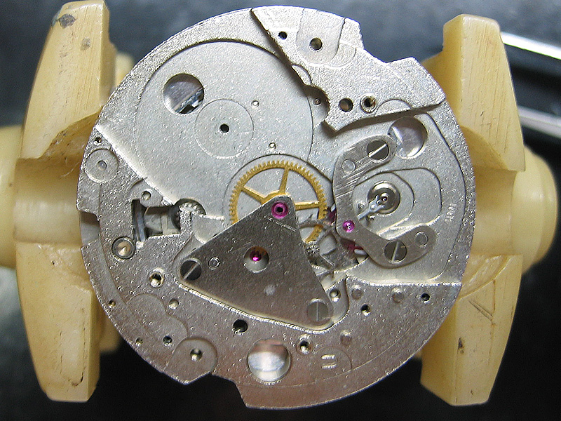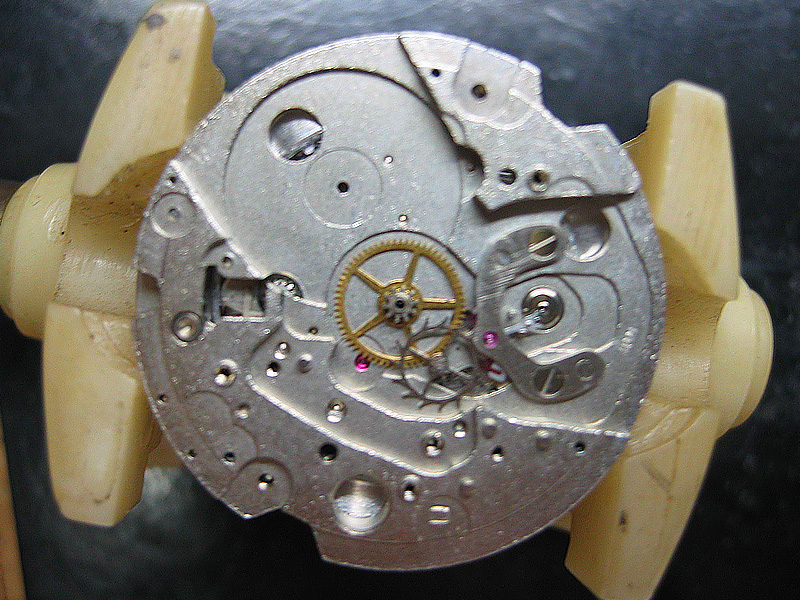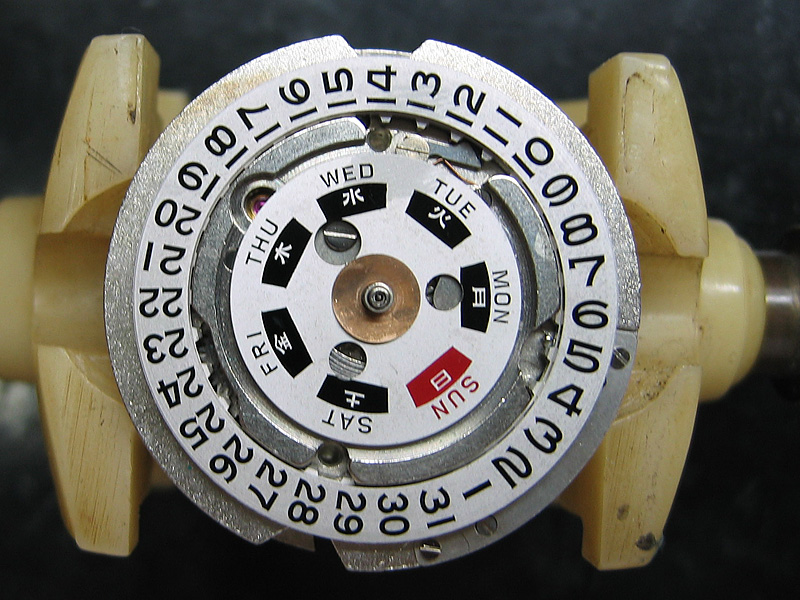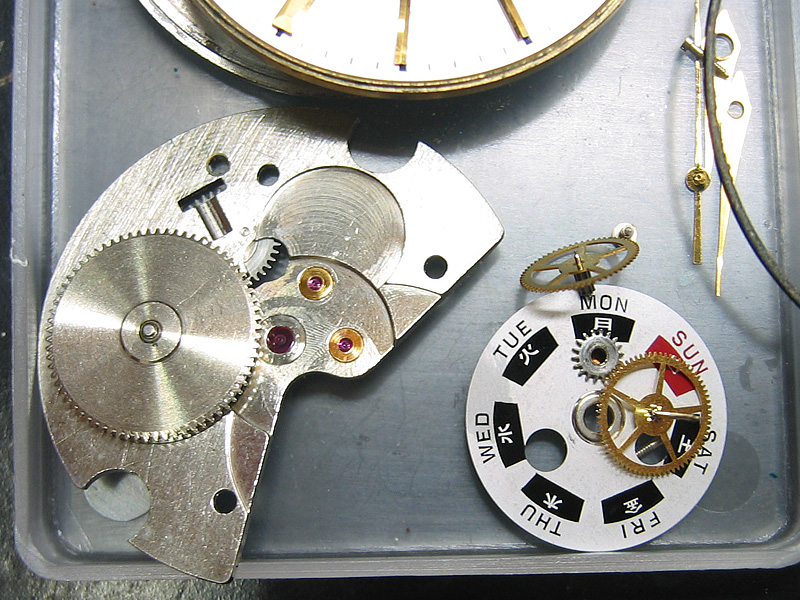 こいつも廃品BOXの中に、無造作にしまいこんでありました。外装は、メッキ擦れて薄くなりガラスも傷だらけかろうじて動く程度なので、分解掃除をしてガラスも製作してあとは、メッキができればいいのですが・・・だたのコレクションに金は、かけれません。これは、カレンダーがちょっと変ってます。曜日を変えるには、ずっと針を回すしかありません。日にちは、りゅうずを最大に引くと日付けが変わります。